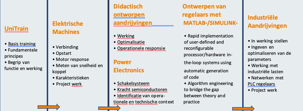 In kleine stappen leren studenten met behulp van de UniTrain cursussen van Lucas-Nülle de werking van elektrische machines. Zo leren ze waar deze motoren in de realiteit gebruikt worden (met voor- en nadelen van iedere motor), hoe ze worden aangesloten en aangestuurd, hoe meetsignalen er uitzien en hoe ze fouten in het systeem kunnen zoeken aan de hand van metingen. Met simpele modellen worden de belangrijkste begrippen zoals AC, DC, driehoek- en sterschakelingen, BLDC, stappen motor, lineair, synchroon en asynchroon behandeld en hebben studenten met kleine oefeningen kunnen zien hoe je de werking ervan kunt meten en beïnvloeden.
